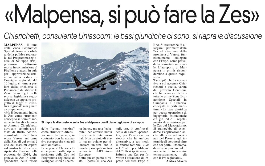 “Fidatevi della parola ZES. Per Malpensa sarebbe ideale“ Intervista all’avv. Antonio Chierichetti in La Provincia di Varese, 5 giugno 2017.